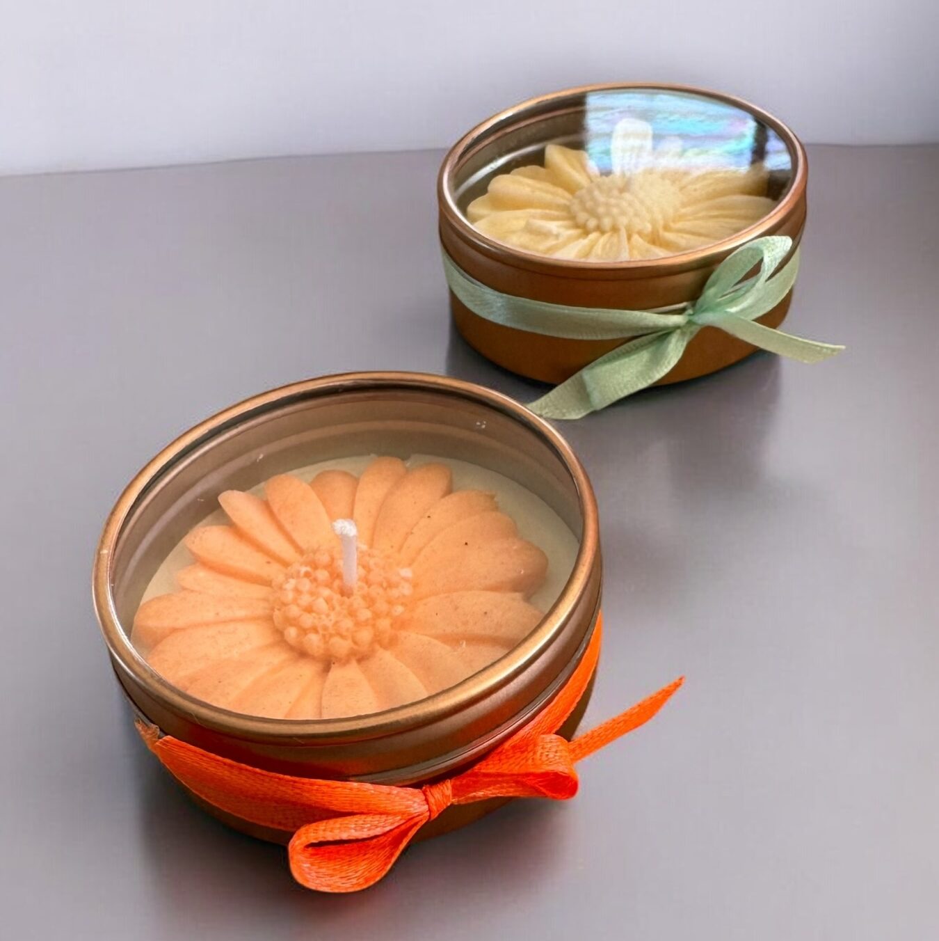 Bougie artisanale coulée dans un pot en forme de fleur, en cire végétale parfumée avec sa mèche en bois.