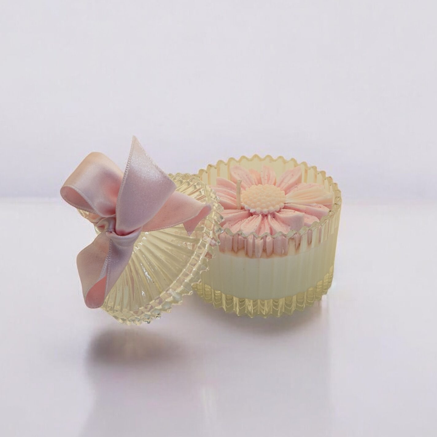 Une bougie parfumée coulée dans une jolie bonbonnière en verre, décorée de fleurs en bougie.