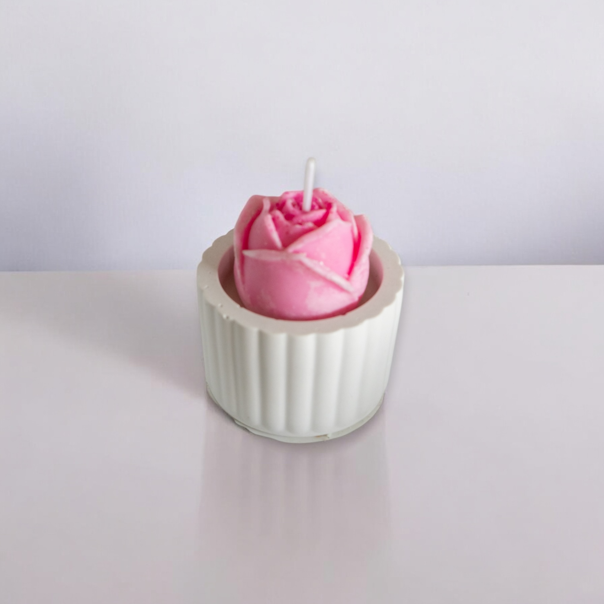 Une rose en cire parfumée au choix bleu ou rose posée dans un pot rond en plâtre fait main.
