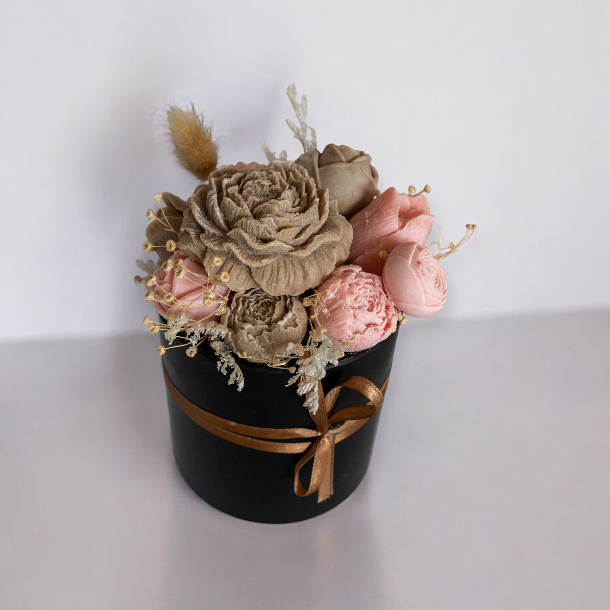Ce bouquet associe l’élégance du noir à la tendresse des bougies 100 % bio et artisanales, dans des tons beige et rose poudré. Chaque fleur est une bougie façonnée à la main avec des ingrédients naturels, pour une ambiance chaleureuse et raffinée. Présenté dans une boîte noire satinée, ornée d’un ruban cuivré, il évoque le chic et la sobriété. Un cadeau intemporel pour sublimer un intérieur ou marquer une occasion spéciale