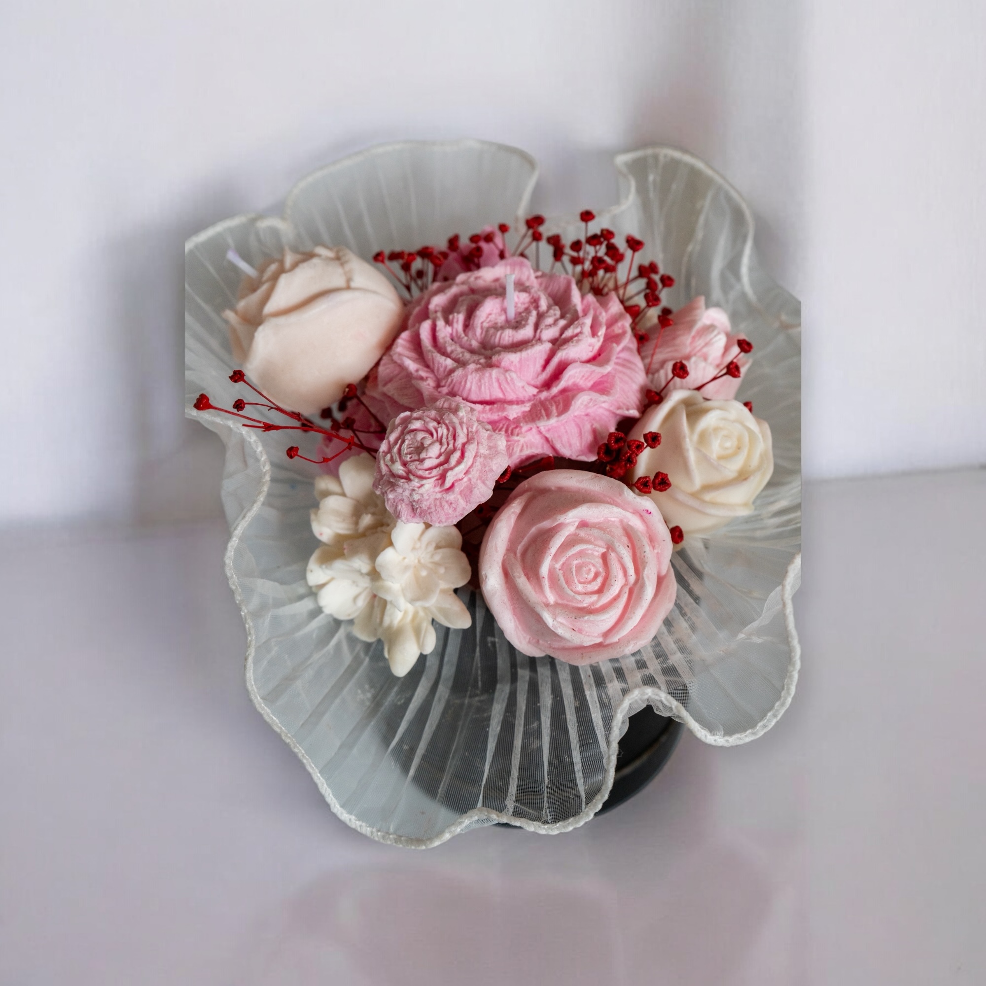 Un bouquet raffiné de bougies artisanales bio, aux nuances rose pastel et blanc cassé, sublimé par un voile élégant et des touches de rouge. Chaque fleur est sculptée à la main avec des matières naturelles, pour une ambiance douce et romantique. Présentées dans une boîte noire chic, ces bougies apportent une touche de poésie et de lumière à votre intérieur. Un cadeau délicat, parfait pour célébrer l’amour, la douceur ou un moment précieux.