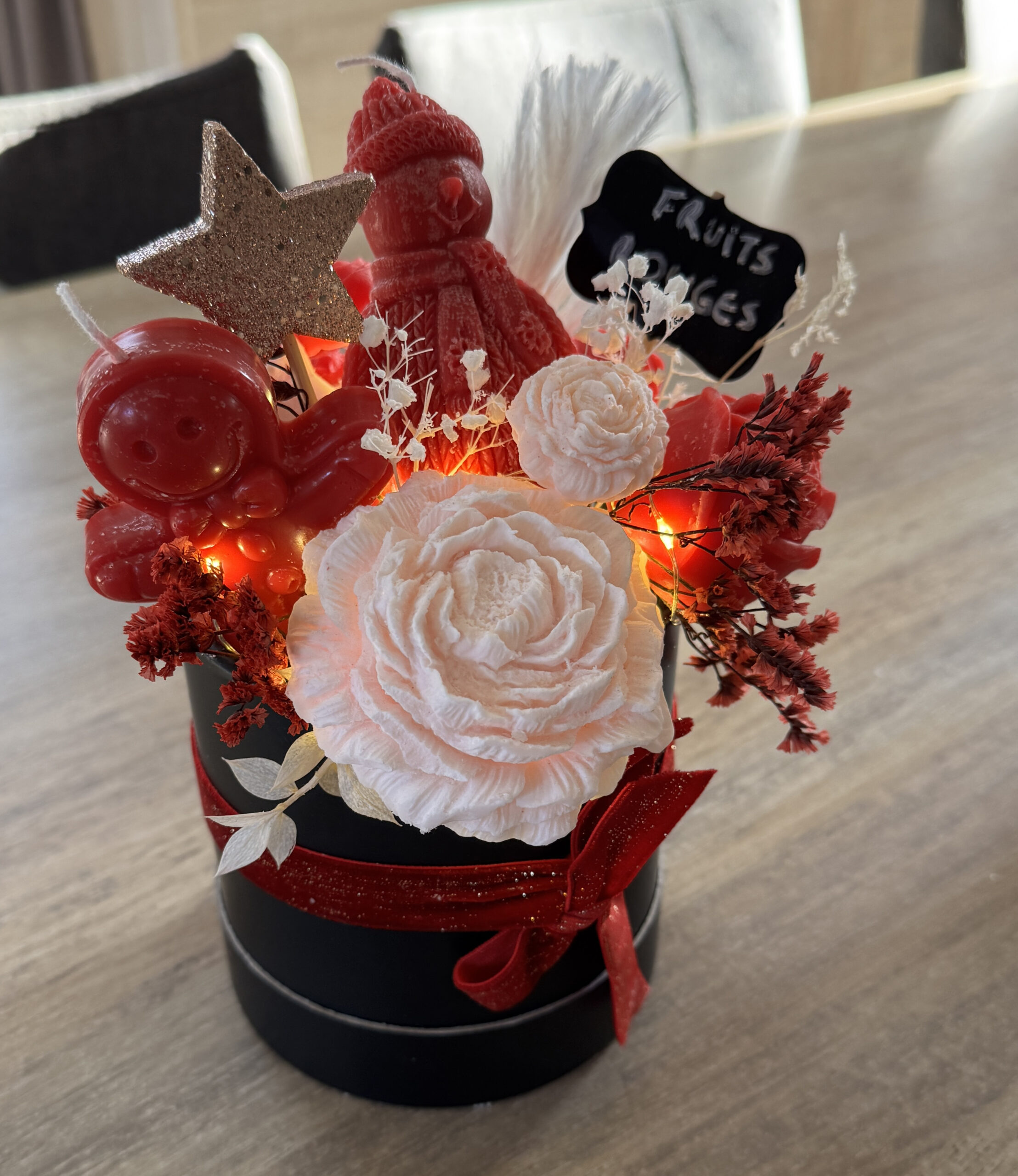 Composé de fleurs en cire de soja Bio, de motifs festifs, d’adorables personnages de Noël et d’une lumière douce intégrée, il crée instantanément une ambiance chaleureuse et féérique.