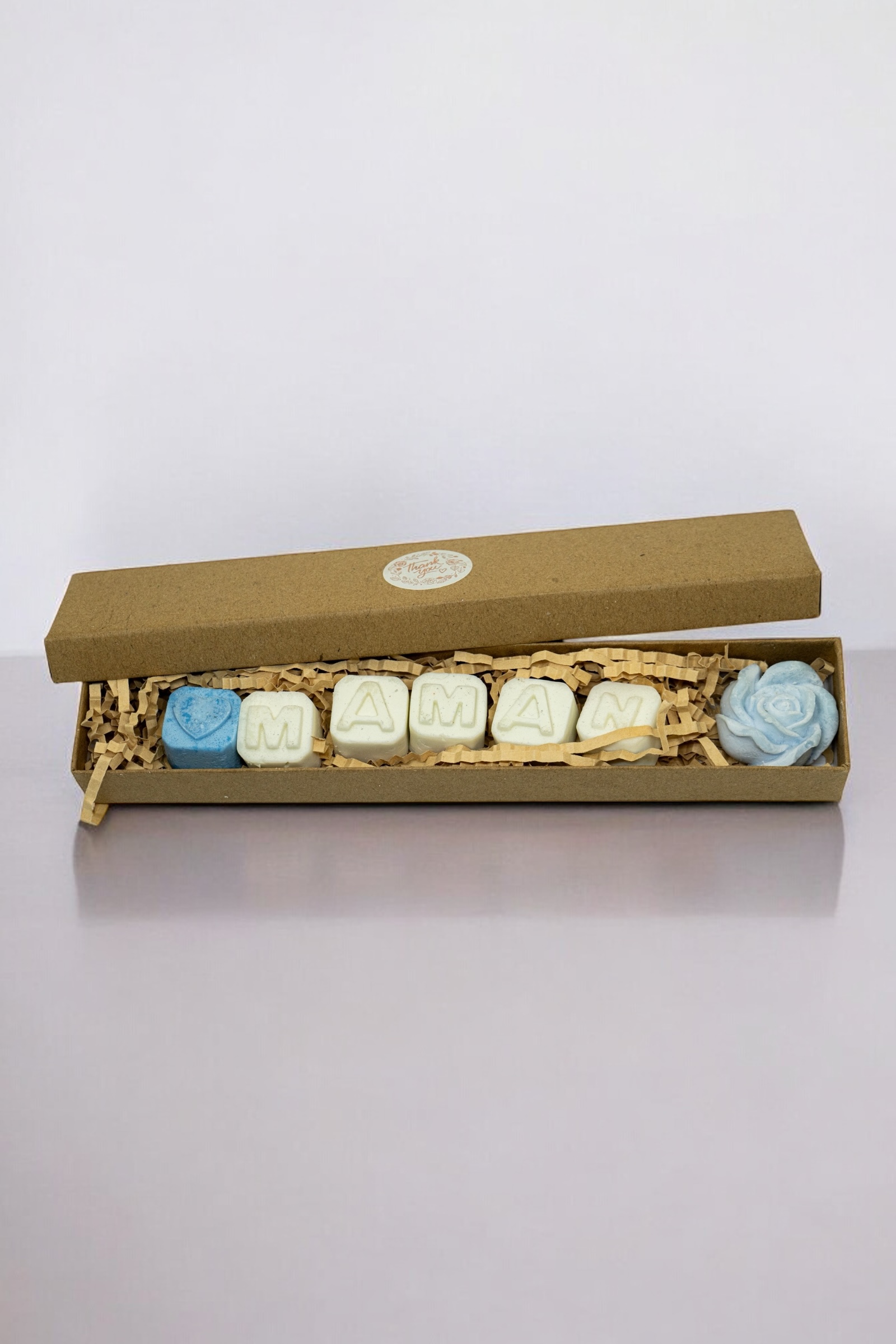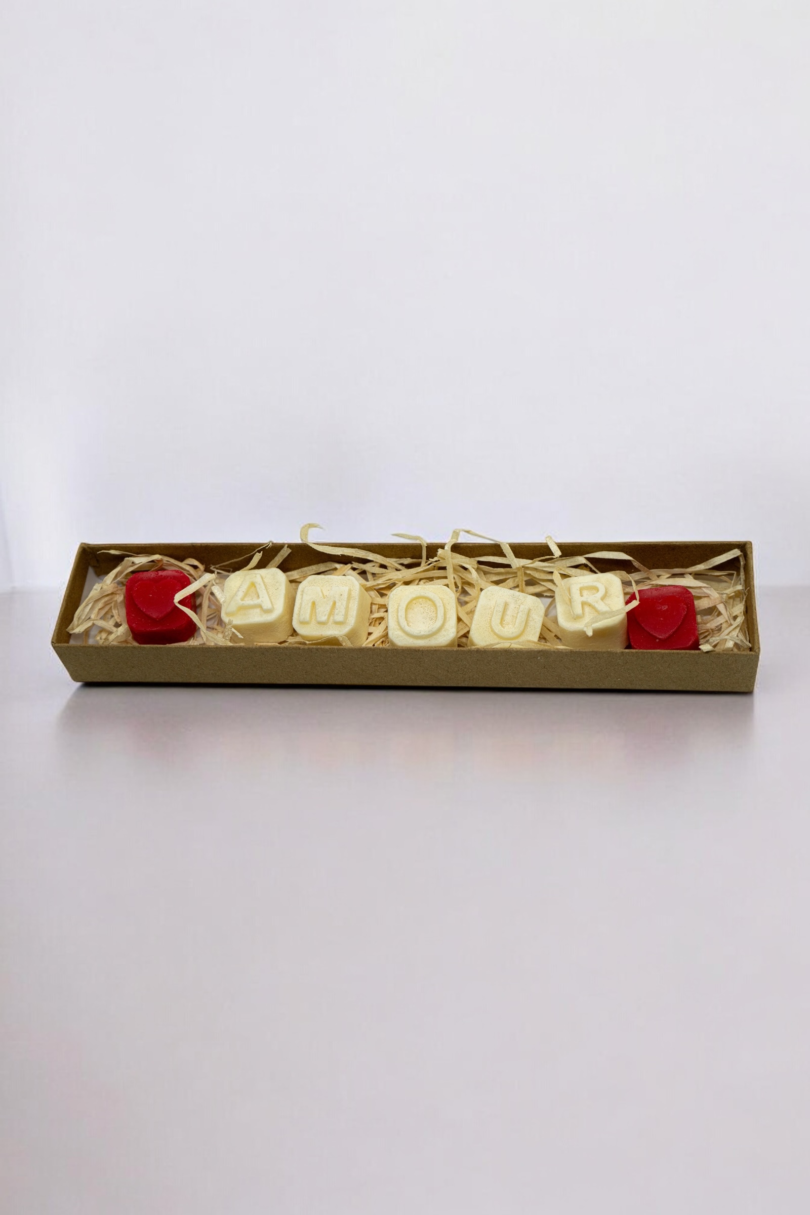 Offrez une attention délicate et parfumée avec cette jolie boîte contenant des fondants en forme de lettres composant le mot au choix couleurs blanches, accompagnés d’une rose et d’un coeur parfumées couleur au choix. Chaque pièce est coulée à la main, parfumée avec soin et présentée dans une élégante boîte kraft.