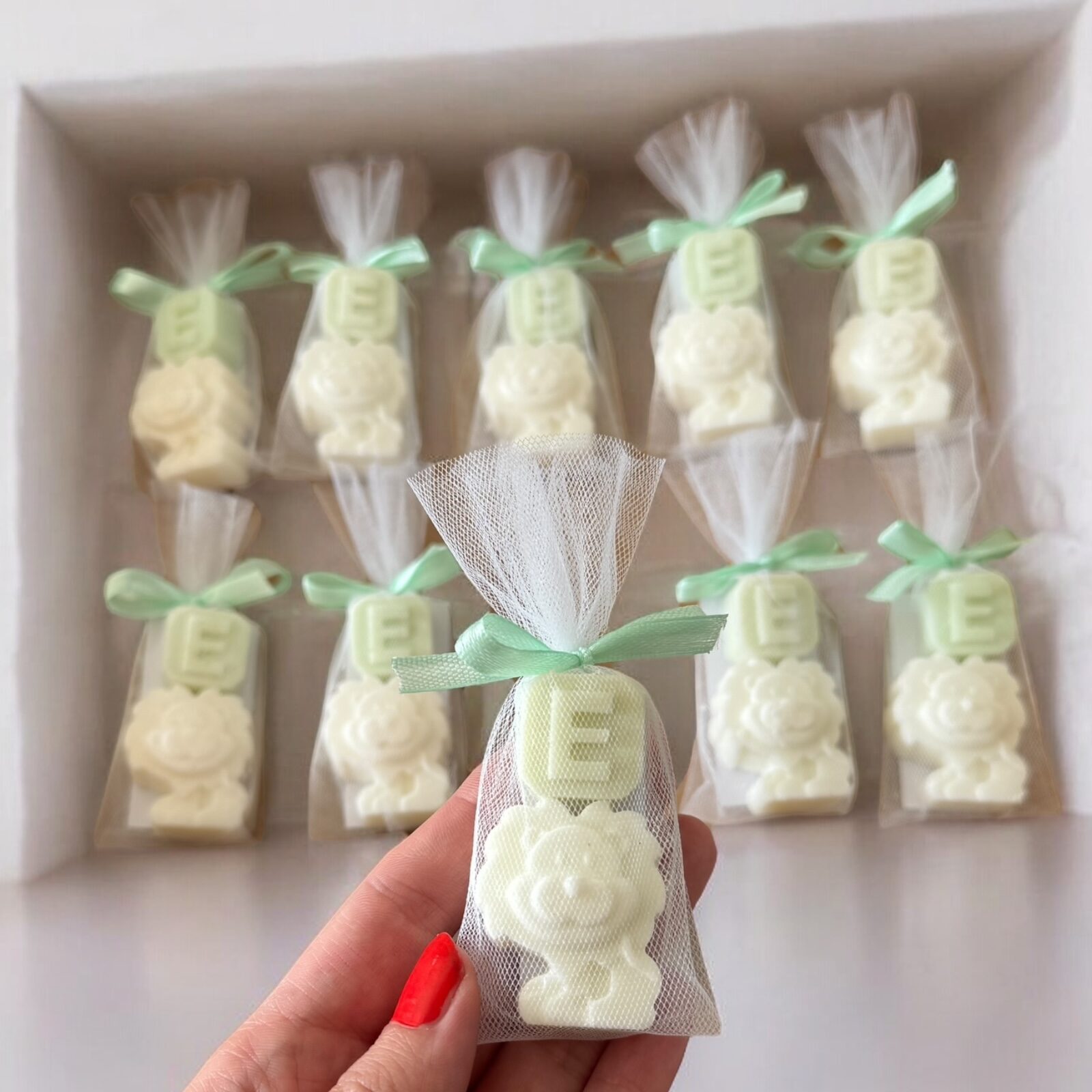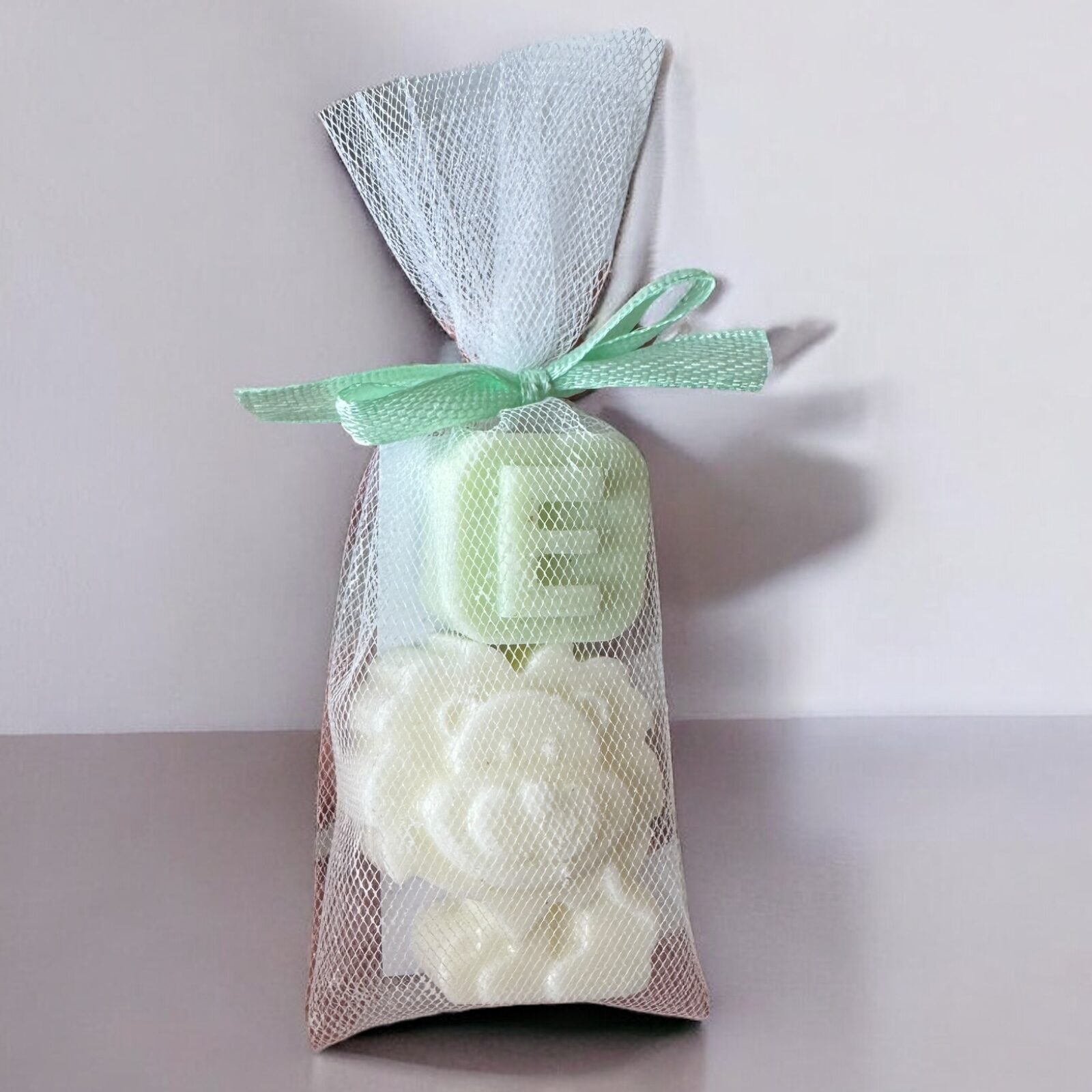 Adorables emballages en tulle contenant deux bougies artisanales parfumées : une en forme de lion ou ourson au choix et l’autre personnalisée avec une lettre en relief de votre choix. Présentées dans un élégant voile blanc noué d’un ruban couleur au choix.