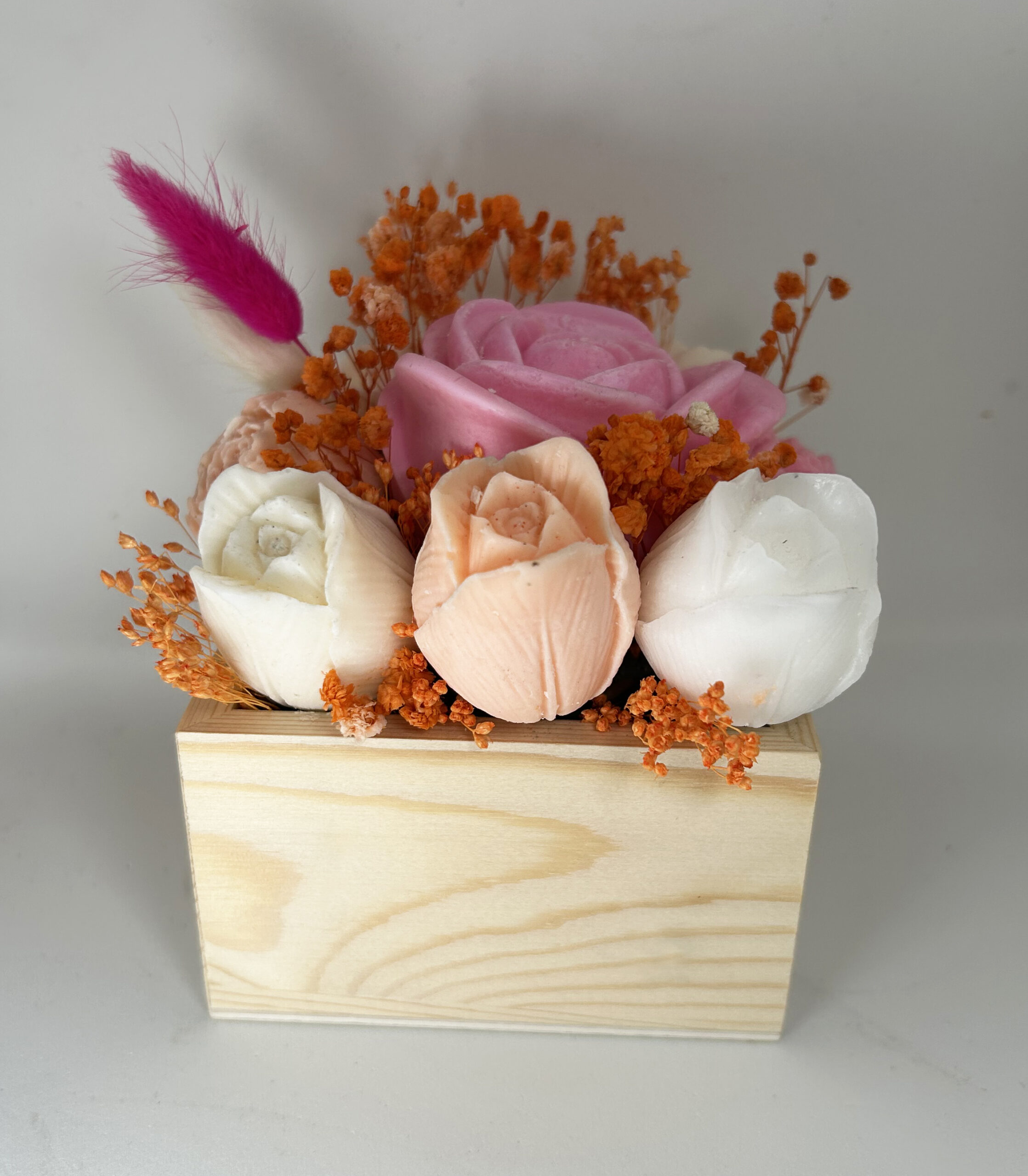 dans sa petite boite en bois agrémentée de fleurs séchées