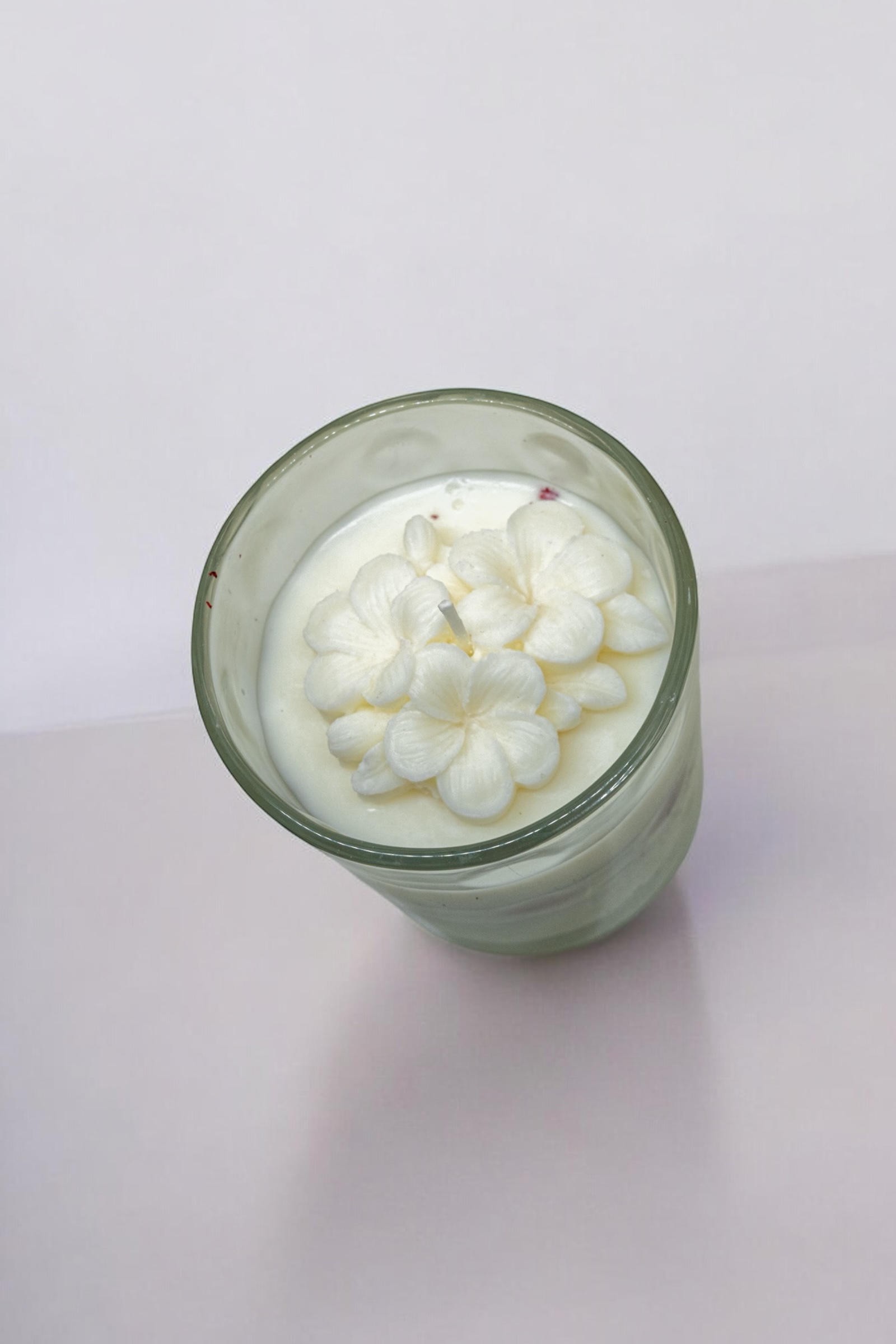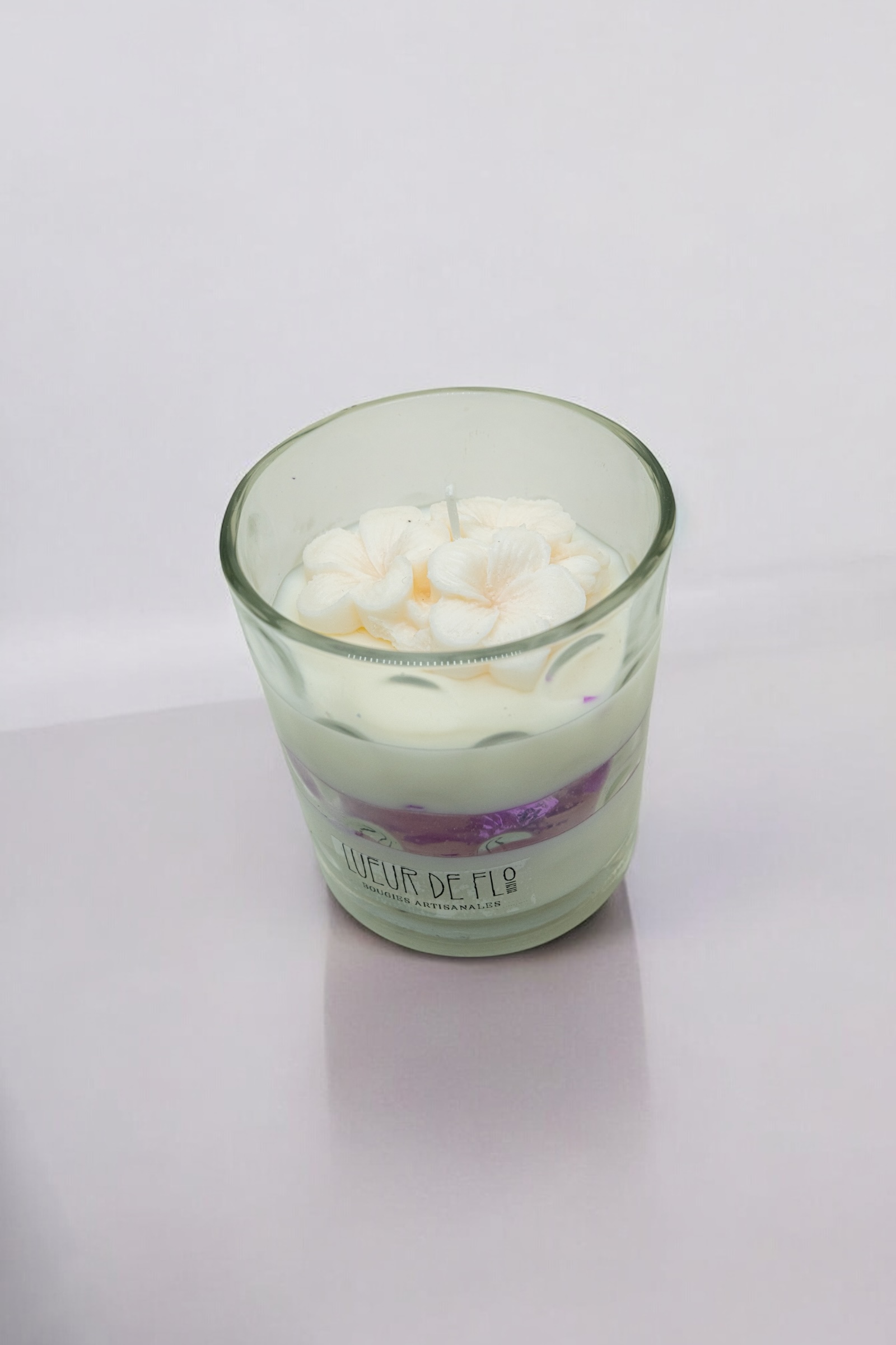 Au sommet, une rose en cire parfumée vient sublimer l’ensemble, telle une fleur posée sur un nuage lumineux.