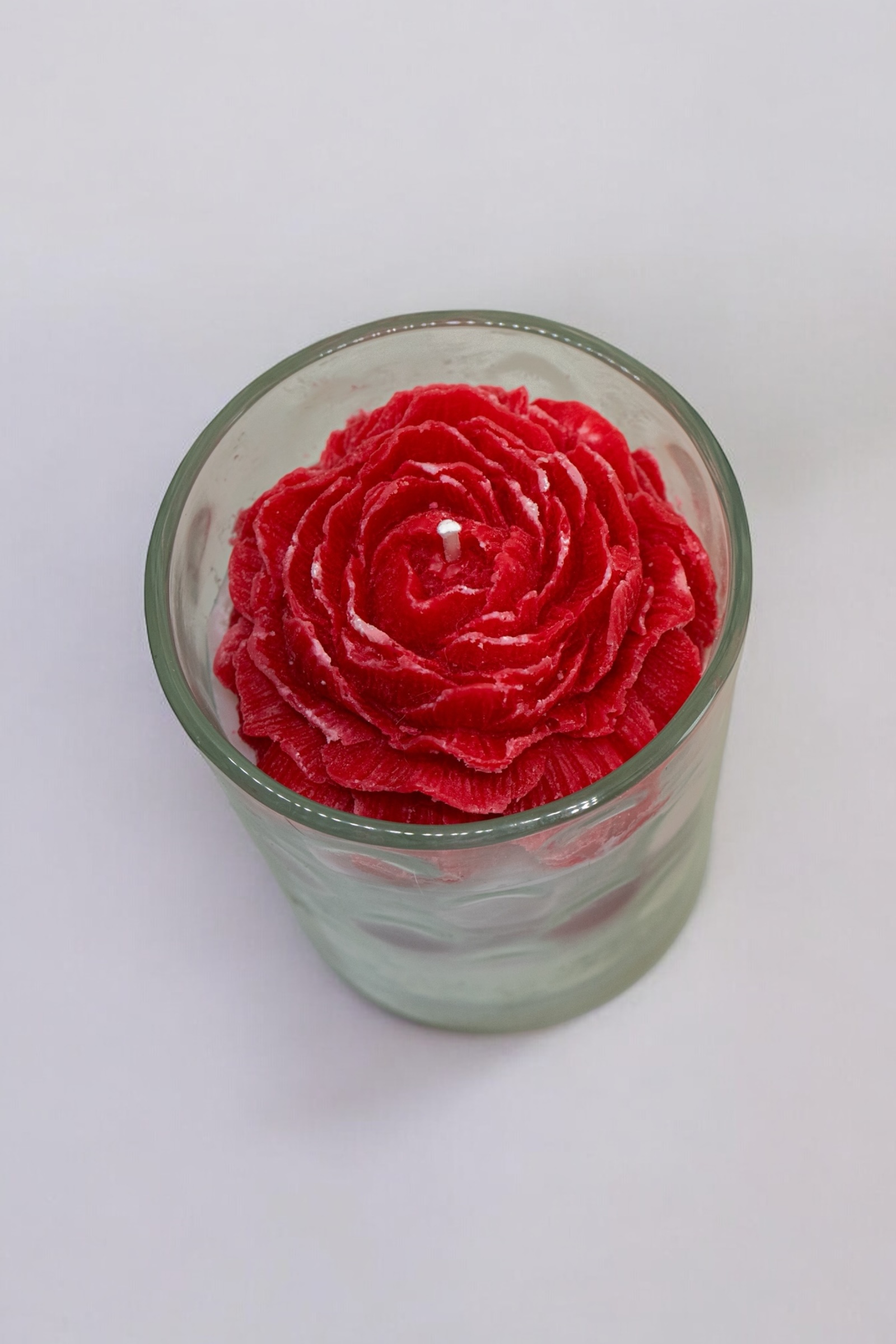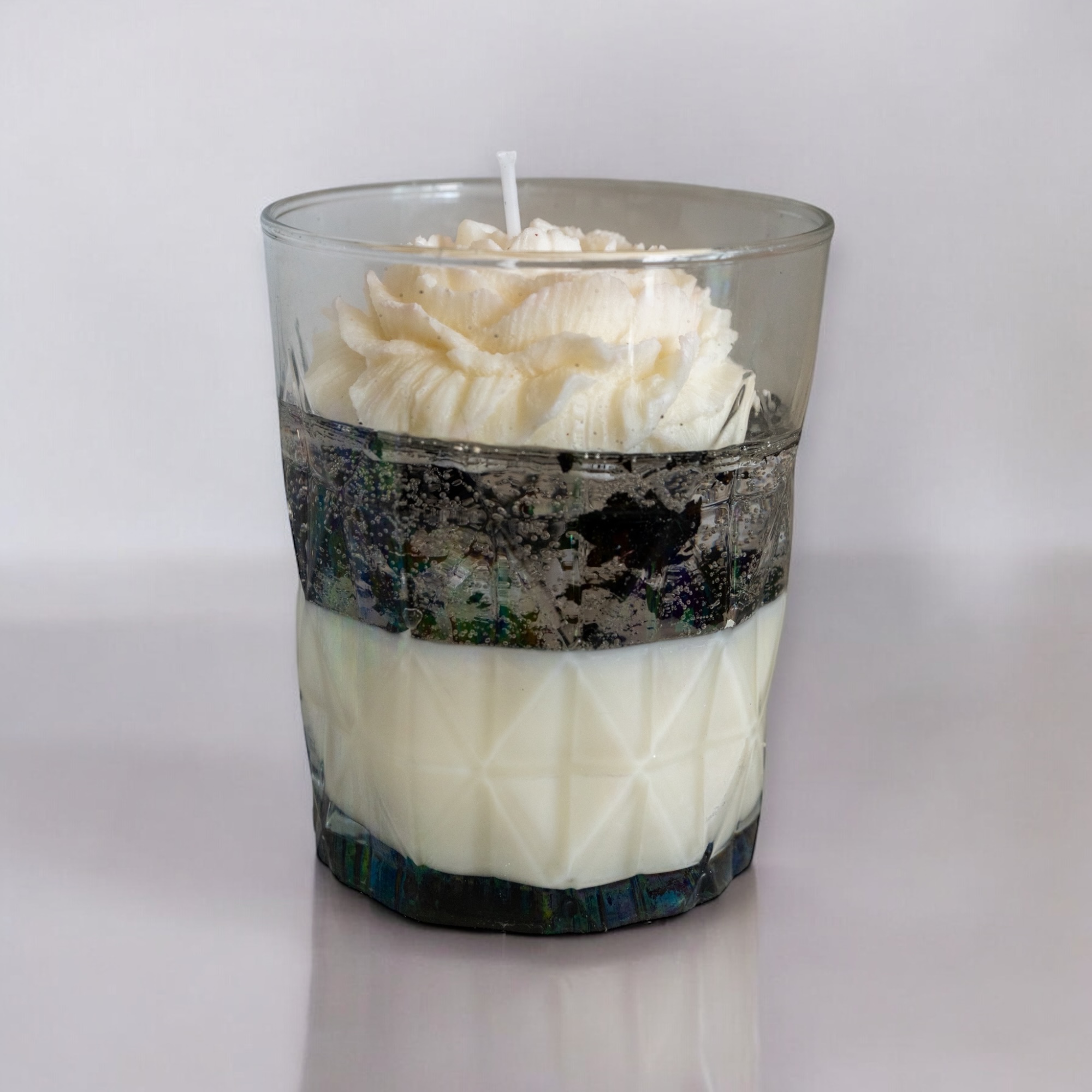 Au sommet, une rose en cire parfumée vient sublimer l’ensemble, telle une fleur posée sur un nuage lumineux.