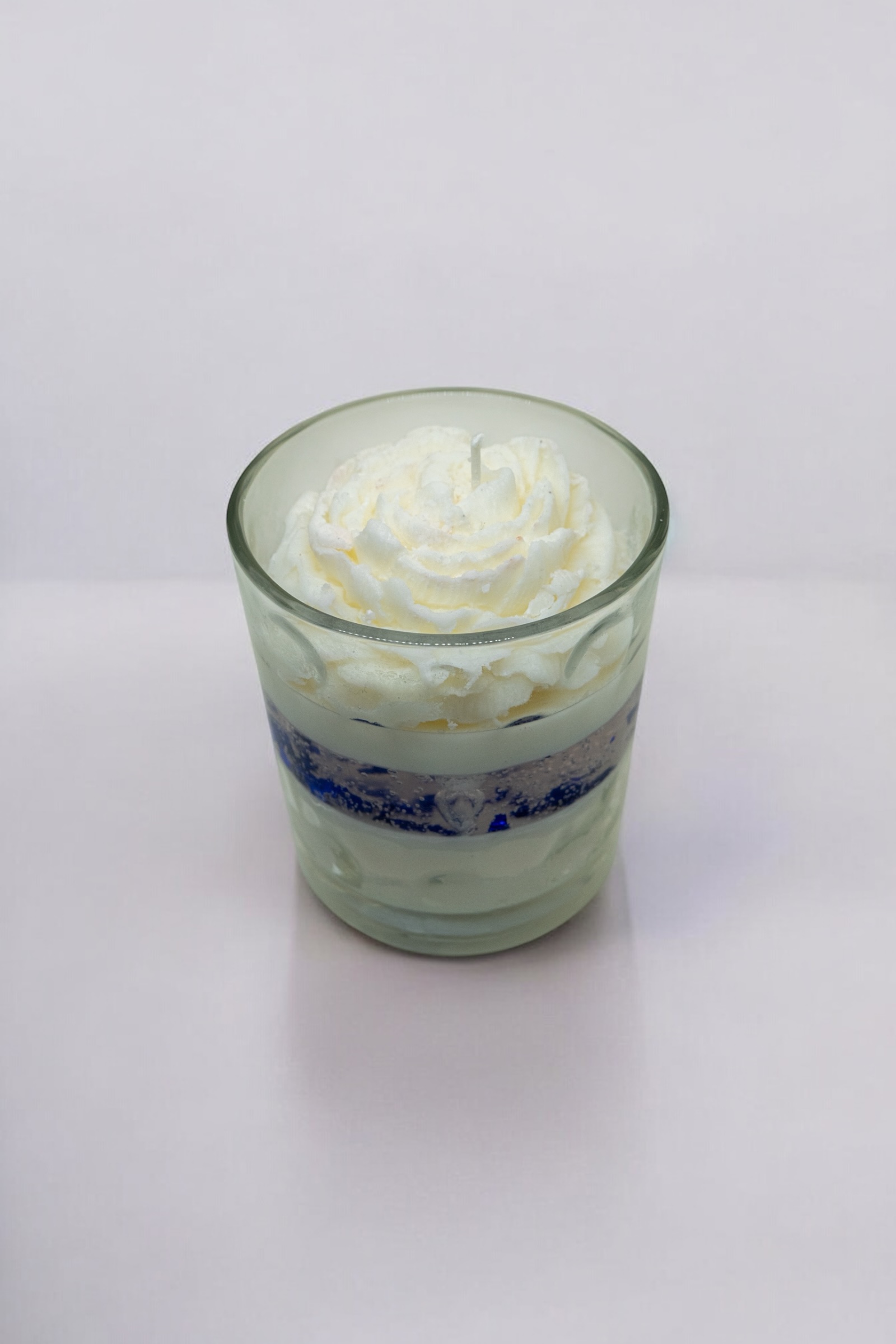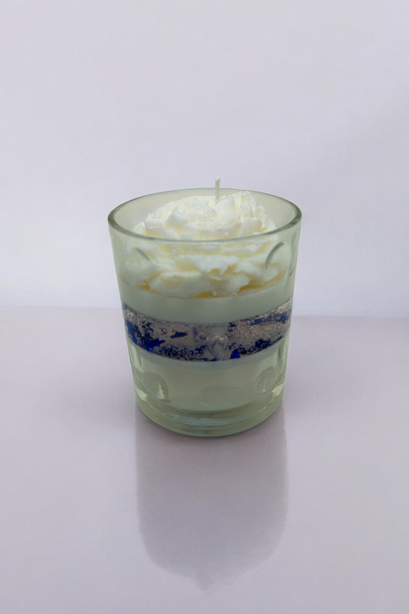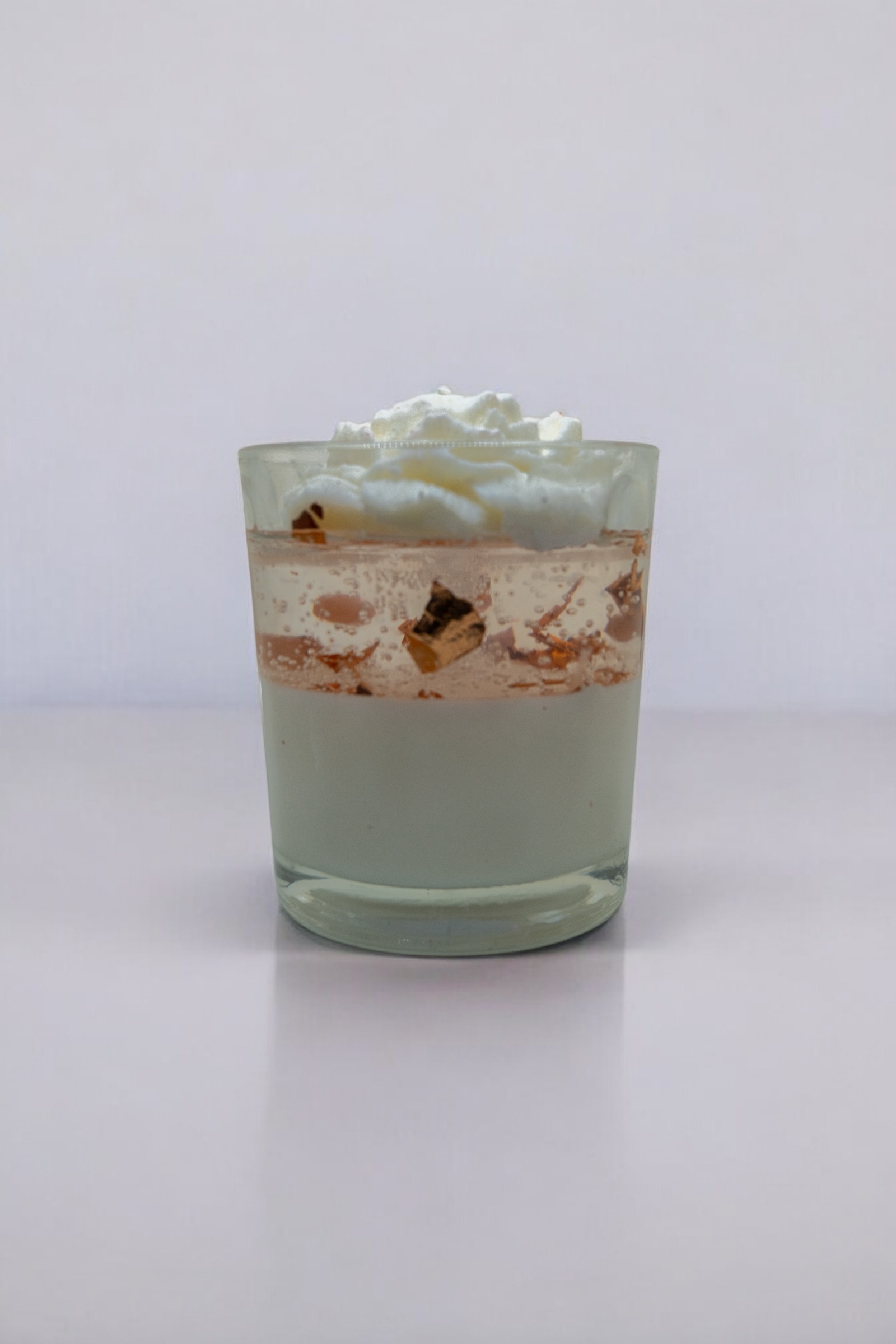 Petit pot de bougie en gelée délicatement infusée de paillettes scintillantes, comme un écrin de lumière capturant la magie.